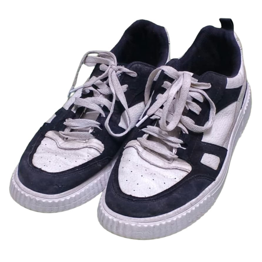 Retro-cool style! Pre-loved Unisex casual sneakers in a sharp black/navy and white color block. Features a chunky, stylish ribbed platform-style sole. Perfect for adding a vintage court vibe to any casual outfit.