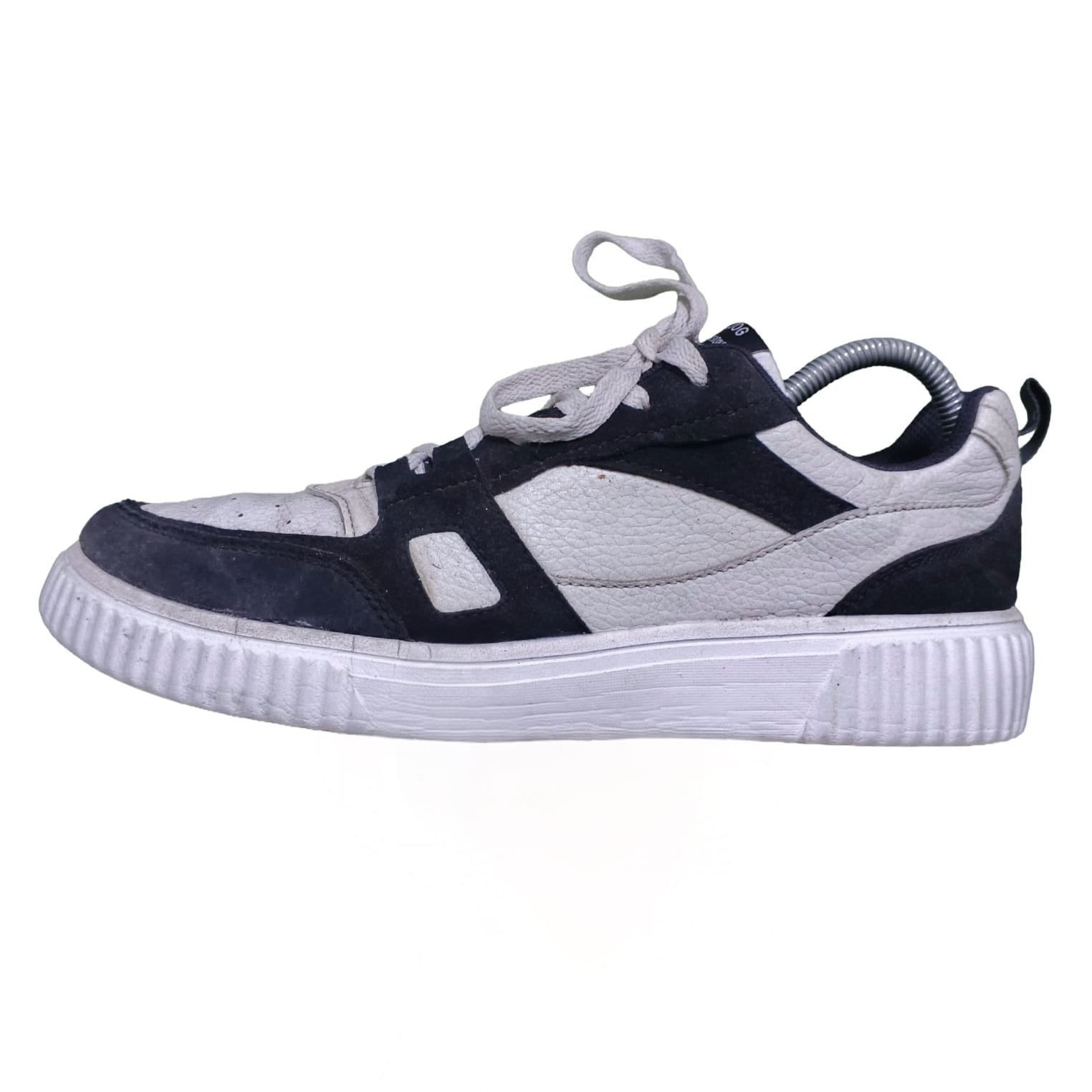 Condition: Pre-loved (used). The shoes show typical signs of wear, including creasing on the white sections and some dirt/scuffing on the sole and dark suede panels. They are a functional, stylish pair ready for their next owner. Please examine all photos for detailed condition.